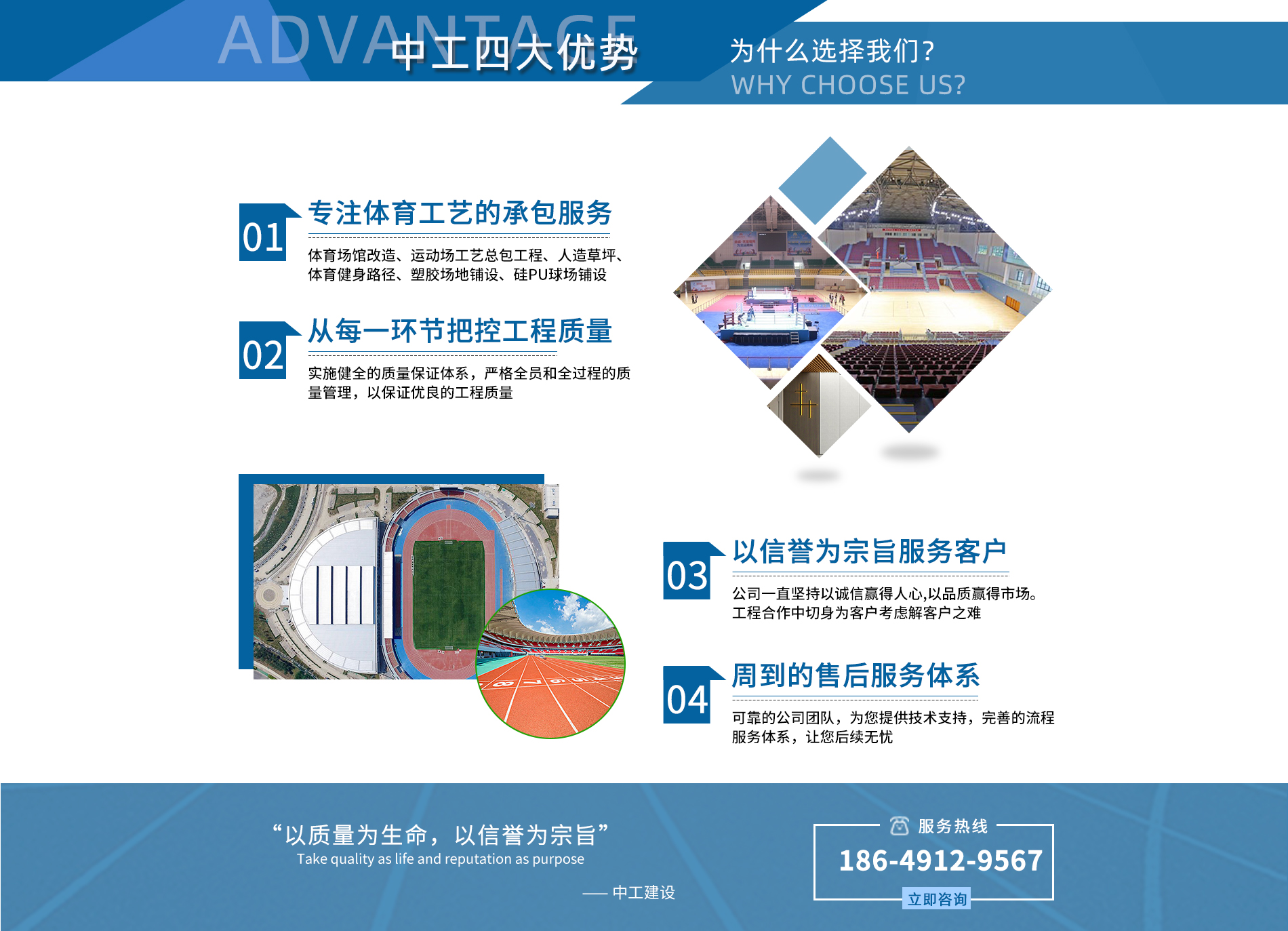 關(guān)于我們中工(天津)建設(shè)有限公司位于天津?yàn)I海高新區(qū)華苑產(chǎn)業(yè)區(qū)(環(huán)外)海泰創(chuàng)新六路2號(hào)18-2-201,擁有680平自有辦公設(shè)施場(chǎng)所,是集工程建設(shè)的可行性研究、體育工藝總包、建筑工程總承包、施工管理、技術(shù)咨詢(xún)、工程設(shè)計(jì)、項(xiàng)目管理、技術(shù)服務(wù)、體育場(chǎng)館建設(shè)、體育設(shè)備運(yùn)營(yíng)為一體的國(guó)際型工程公司。公司通過(guò)不斷經(jīng)營(yíng)完善體系服務(wù)架構(gòu),共獲得建筑裝修裝飾工程承包貳級(jí)資質(zhì),建筑工程、市政公用工程兩項(xiàng)施工總承包叁級(jí)資質(zhì),電子與智能化工程承包貳級(jí),地基基礎(chǔ)工程承包叁級(jí),鋼結(jié)構(gòu)工程承包叁級(jí),建筑機(jī)電安裝工程承包叁級(jí),同時(shí)取得了ISO9001質(zhì)量管理體系認(rèn)證、ISO14001環(huán)境管理體系認(rèn)證及GB/T28001職業(yè)健康安全管理體系認(rèn)證等國(guó)家資質(zhì),同期取得了信用企業(yè)證書(shū),獲文明誠(chéng)信、重質(zhì)量、重合同、守信用等多項(xiàng)稱(chēng)號(hào)。